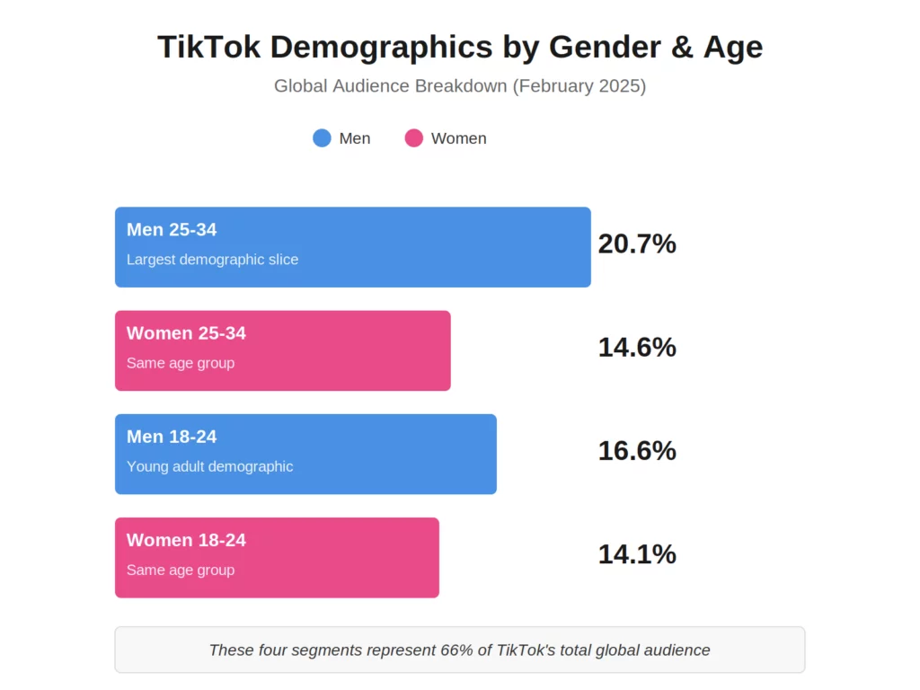 As of February 2025, men aged 25 to 34 make up 20.7% of TikTok’s global audience, the largest demographic slice. Women in the same age group account for 14.6%.
