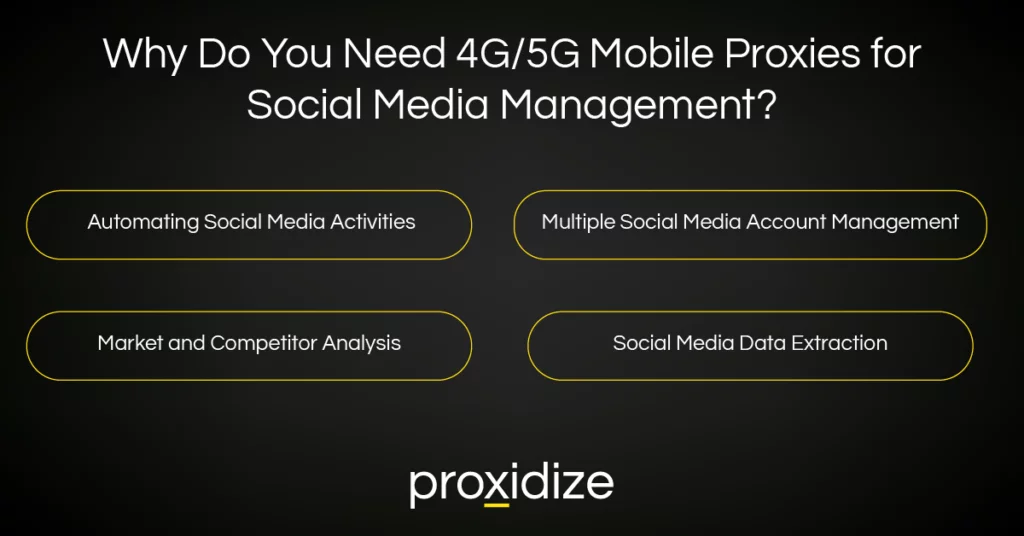 For effective social media management, you need 4G/5G mobile proxies to create multiple social media accounts. Mobile proxies are essential because they allow you to connect to social media platforms through different mobile networks, giving you a unique IP address for each account.
