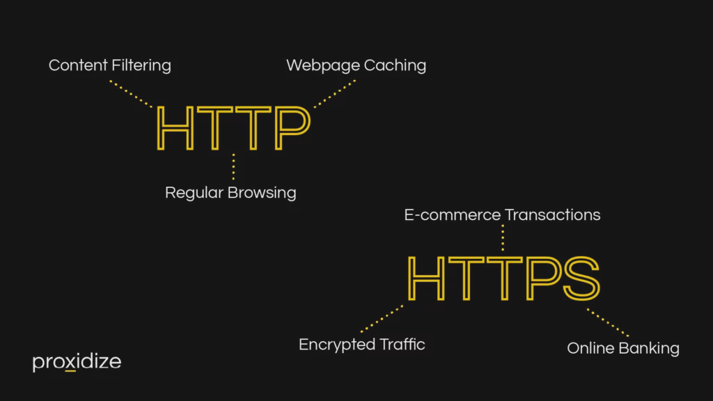 - Encryption Limitations HTTPS encrypts HTTP traffic using SSL/TLS, which means the HTTP proxy cannot inspect the contents of data without first decrypting it, processing it, then reencrypting it.